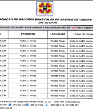 A ADBSVNOVAS informa todos os interessados, que as Colheitas de Sangue para o ano de 2026, em colaboração com o Hospital Espírito Santo de Évora, se realizam de acordo com Calendário em anexo, sempre na Sede da Associação. Como sempre contamos convosco. Compareça e traga um amigo, um familiar. Os doentes agradecem.