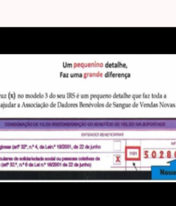 AJUDE-NOS A AJUDAR Um pequenino detalhe, Faz uma grande diferença Uma simples cruz (X) no modelo 3 do seu IRS é um pequeno detalhe que faz toda a diferença para ajudar a Associação de Dadores Benévolos de SANGUE de Vendas Novas. Qualquer pessoa ao preencher o seu IRS pode consignar 1% do seu imposto a favor da nossa Associação. É um dinheiro que, caso não vá para uma Instituição/ Associação fica nos cofres do Estado. Basta colocar o NIF 502 806 800 no campo 1101 - “Instituições particulares de Solidariedade social ou Pessoas Coletivas de Utilidade Pública” do Quadro 11, na folha de rosto do Modelo 3 do IRS Não deixa de receber, nem paga mais IRS ou IVA por isso, e permite que prossigamos com o projeto de ajudar aqueles que necessitam de SANGUE. Visite-nos, conheça o nosso trabalho e ajude-nos a ajudar quem mais precisa. Ofereça-nos o lado bom do seu IRS! A Direção da ADBSVNOVAS agradece O Presidente da Direção Virgílio Augusto Teixeira